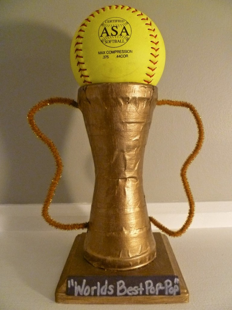174. Ray’s Father’s Day “World’s Best Pop Pop” trophy made by the loving hands of his daughter and grandson. (The game winning softball sitting on top is from a game where Ray was MVP.)