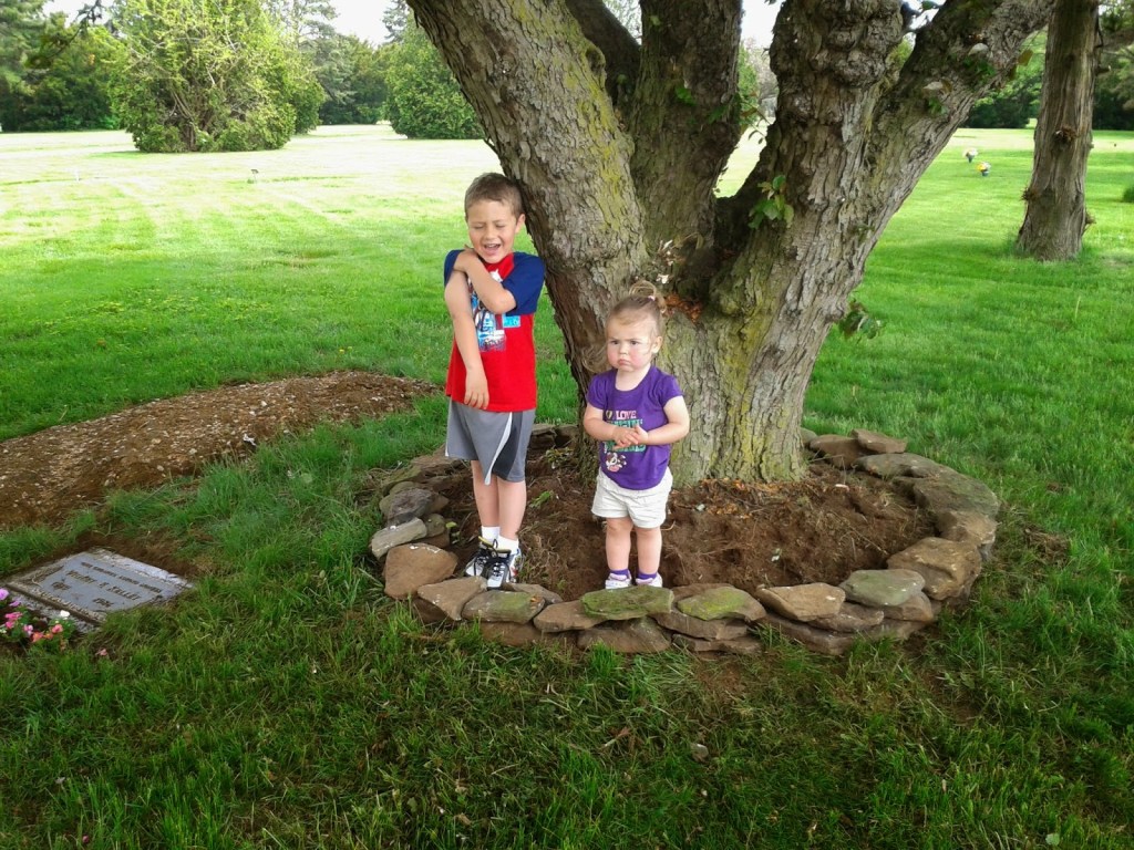 Husband and I live in Maryland. Daughter ‘n’ Son-in-Law, and grandkids live in New Jersey. My mother and stepfather are buried in New Jersey at the end of a row, under a tree, next to a wide open field. As a beautiful and wonderful and thoughtful Mother’s Day gift to me, the kids cleaned the graves, landscaped around the tree, took Before and After pictures. (Itchy Ryan and Pouty Samantha don’t seem all that thrilled to be posing.) But, anyway . . . there is just one wee problem. See the sorta new grave to the left of my mother’s bronze plaque? That’s MY grave site! Someone is buried in my grave, and unless I am living in a parallel universe, it isn’t me! I called the cemetery. The very pleasant woman who answered the phone said, “Let’s see what happened.” Um . . . we know what happened . . . sigh.