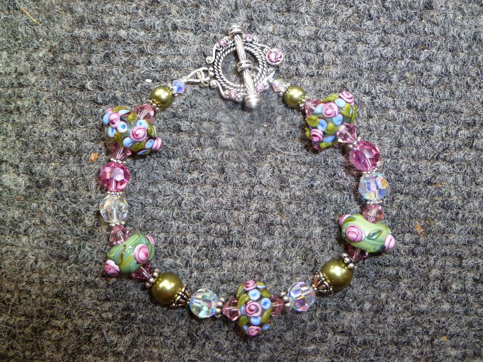This Bracelet was designed and made by the very pleasant, welcoming, generous, and talented Jan Tanis from The Comfort of a Safe Place. She was reaching her 400th post and celebrated by giving away beautiful, quality jewelry every twelve hours for a few days. I am delighted to have won this lovely bracelet. I told Jan it is probably the “prettiest” thing ever I’ve owed. Jan describes it as having, “Five Lampwork Beads and silver spacers and bead caps, Swarovski Crystals, Pearls and Clasp.” All I know is that it makes me feel like a fairy princess to wear it! Thank you Jan.
