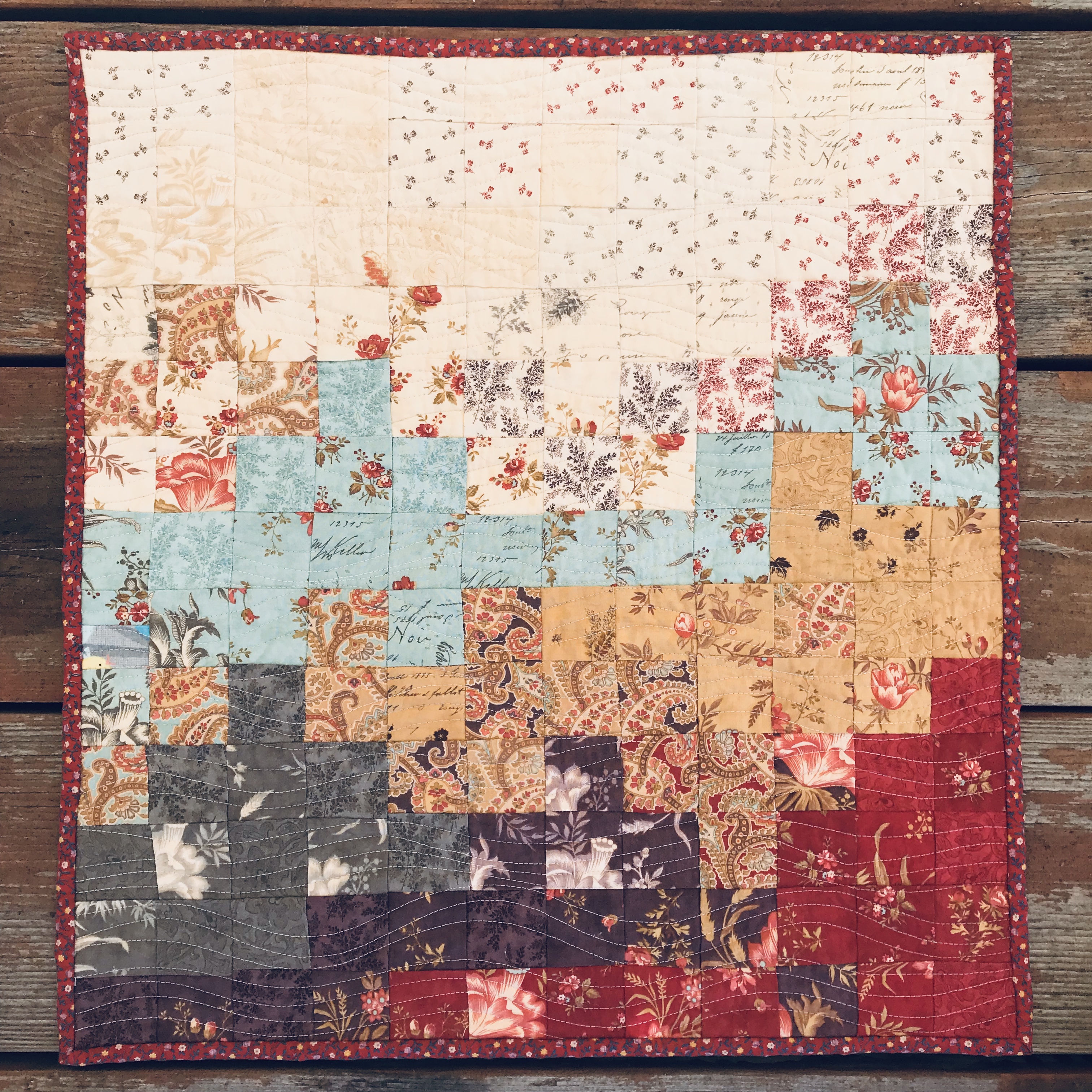The 156 blocks finished at approximately 20×21 in/51×53 cm. I quilted it in wavy horizontal lines to mimic the peaks and valleys. It’s the first abstract representational quilt I have made. Hope you like walking in Shenandoah National Park with me. Here’s the song if you care to have a listen: https://youtu.be/oTeUdJky9rY