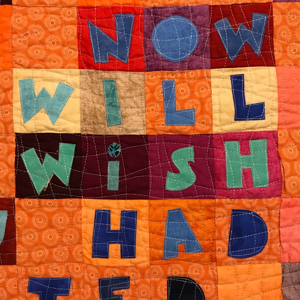 2. Wonder why you are turning 65 soon and still can’t play piano even though wanting to for twenty years. Enter “wish” in Pinterest. Discover a wry, motivational quote. Ah-ha! Decide on a fusible appliqué word quilt and dive in with the usual “only stash, only squares” rule. Find a font, print it out, transfer to fabric, blah, blah, blah. Remove the kitten about a thousand times from the middle of things. Have less fun than anticipated.